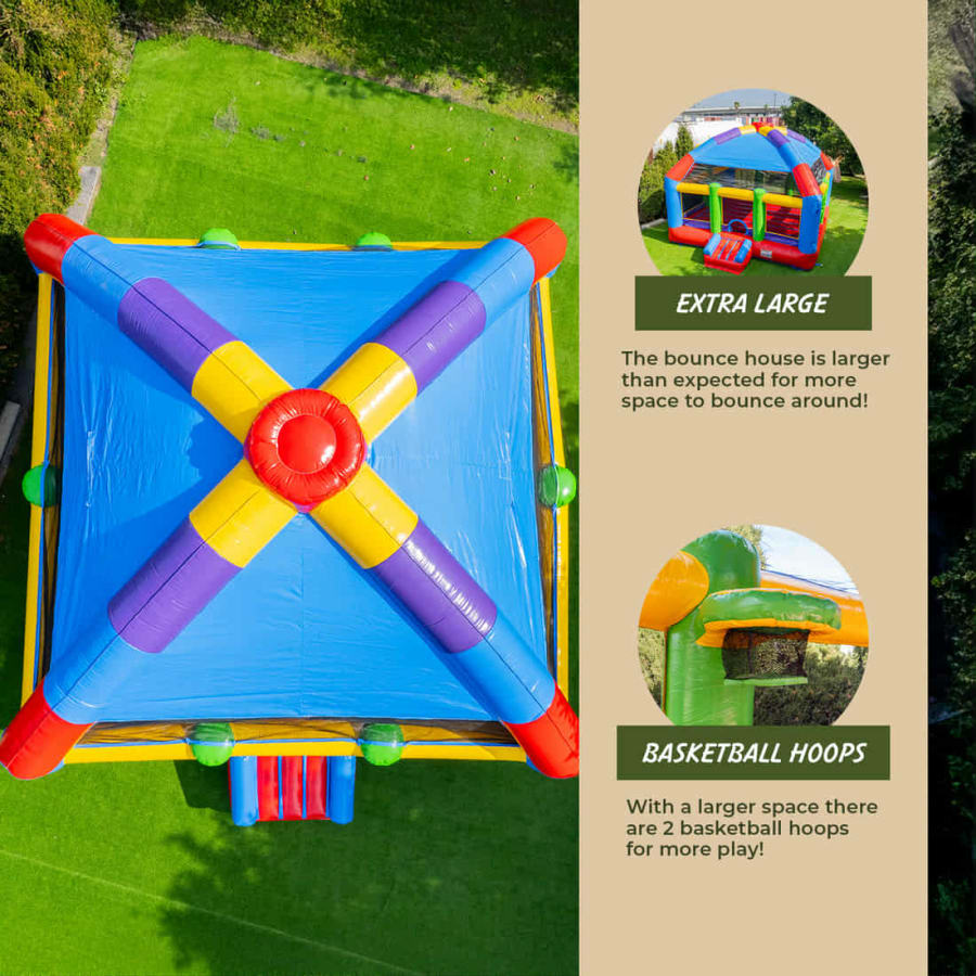 Dimensions: 20′ L x 20′ W x 16′ H REQUIREMENTS: All inflatable rentals require a relatively flat surface, free of sticks, rocks, and animal waste prior to setup. This includes ensuring upward clearance for obstacles such as tree limbs, etc, that can damage units. Minimum of 10 feet clearance is needed .