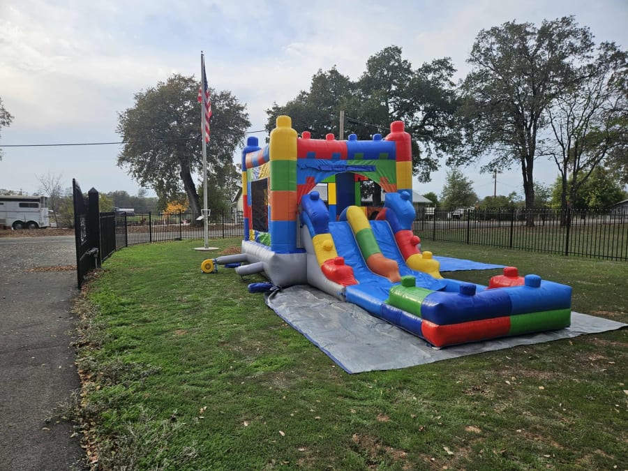 For customers who prefer one combined inflatable, the Lego Bounce House and Waterslide Combo provides both bouncing and sliding in a single footprint.